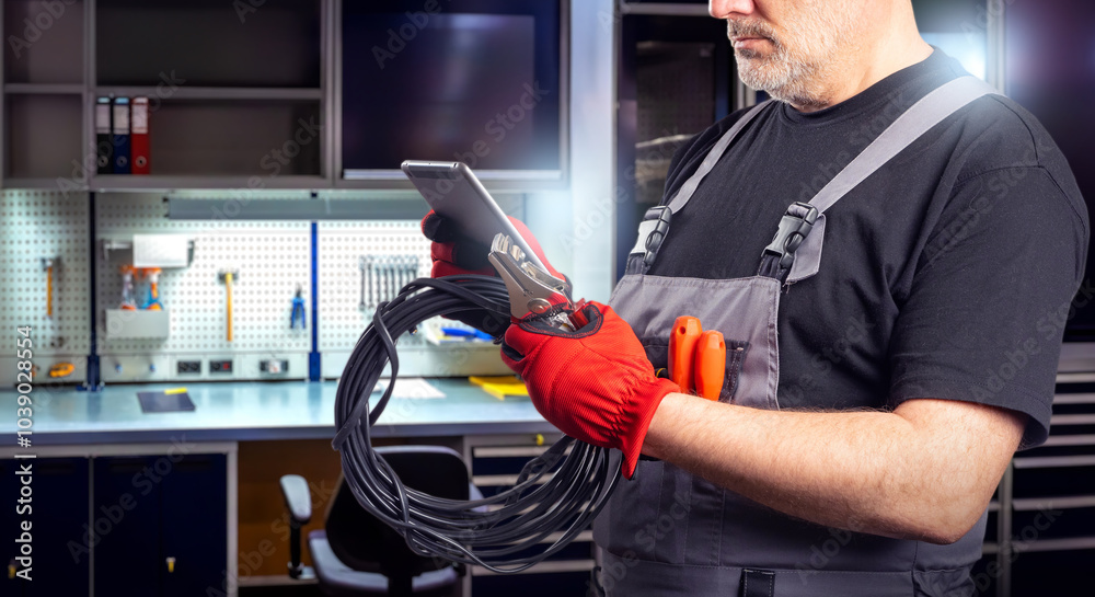 Man electrician at car workshop. Electrical equipment repair technician. Cropped service center electrician. Auto repair shop employee with e-tablet. Electrician with wire to repair car electronics