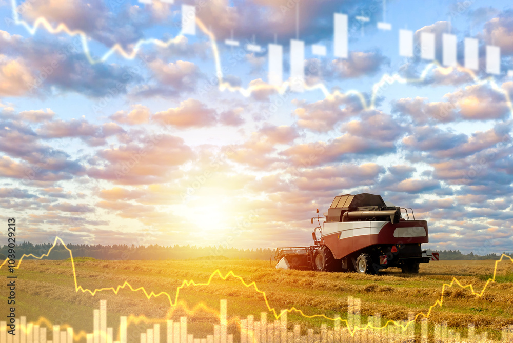 Combine harvester removes wheat from field. Agricultural business. Harvest growth chart. Agricultural combine working in field. Equipment for grain harvesting. Agricultural harvester under summer sky