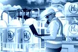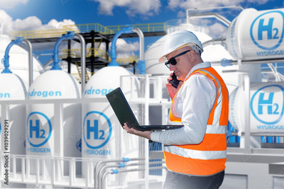 Man employee of hydrogen power plant. Power plant technologist with laptop in hands. Man engineer near hydrogen tanks. Plant technologist is talking on phone. H2 logos on hydrogen tanks
