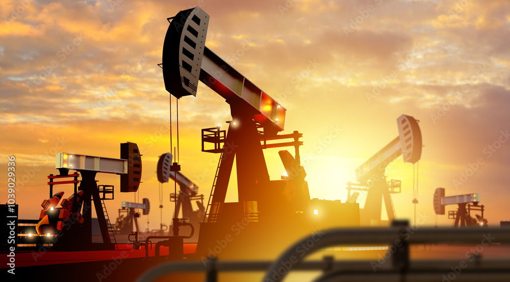 Oil rigs at sunset. Petroleum deposits. Crude oil production site. Industrial landscape in evening. Oil rigs pump petroleum. Gasoline production. Pumping petroleum out of ground. 3d image