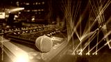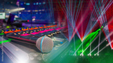 DJ console. Equipment for disco. Mixing console with microphone. Light music near DJ console. Equipment for night club. Spotlight beams near mixing control panel. Concert, festival, party