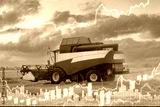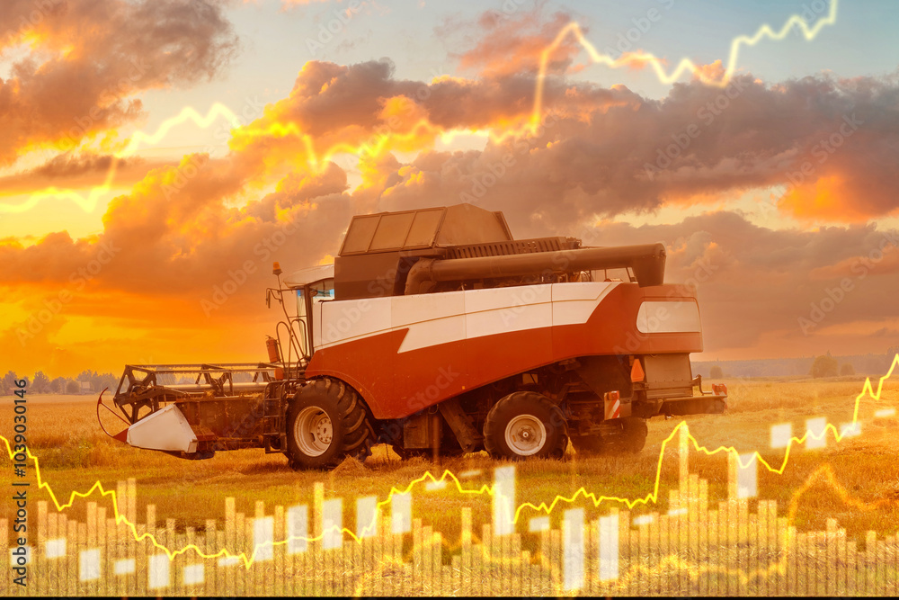 Agricultural business. Combine for harvesting wheat. Agricultural machinery in field. Chart of income growth from sale of wheat. Agricultural industry. Combine harvester drives across field at sunset
