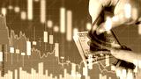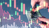 Dollars in hands of man. Fluctuations in price of American currency. Trading charts near cash dollars. Investor recalculates money earned. Buying and selling dollars in USA. Money USD