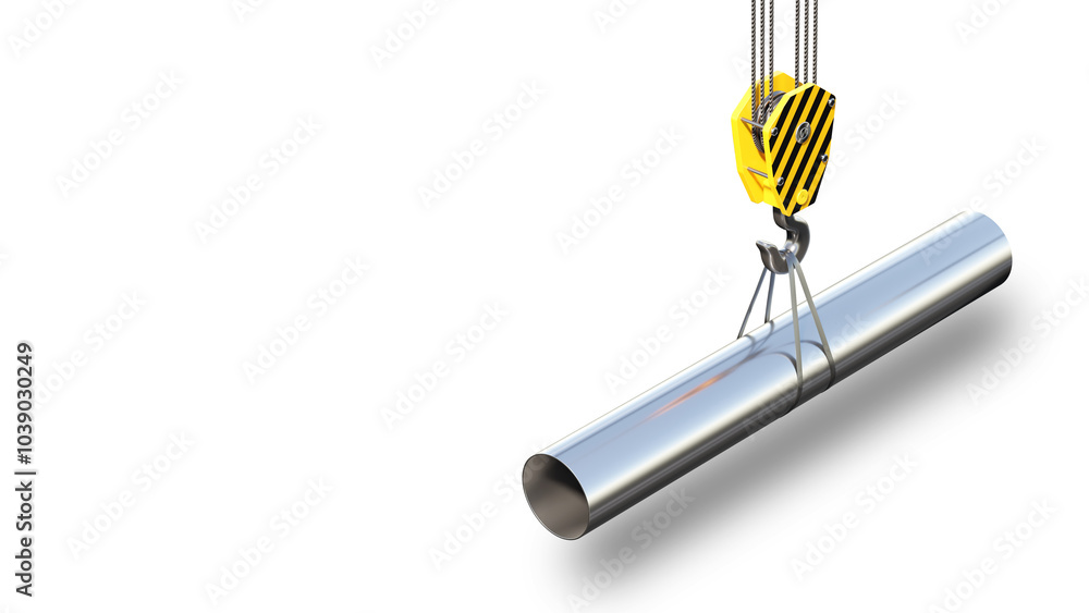 Pipe hangs on hook of lifting equipment. Piece of steel pipeline isolated on white background. Metal pipe for construction of utilities. Hook of tower crane lifting load upward. 3d image