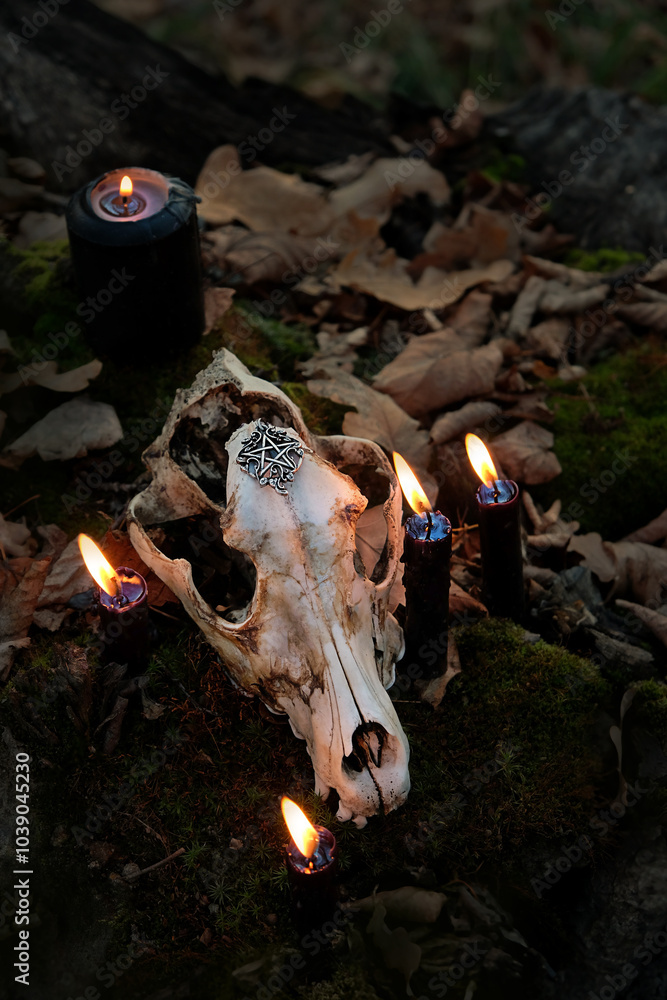 animal skull with burning black candles on dark nature forest background. autumn season. symbol of death, terrible, scary. Mysticism, occultism, Witchcraft, magic ritual. samhain, Halloween concept.