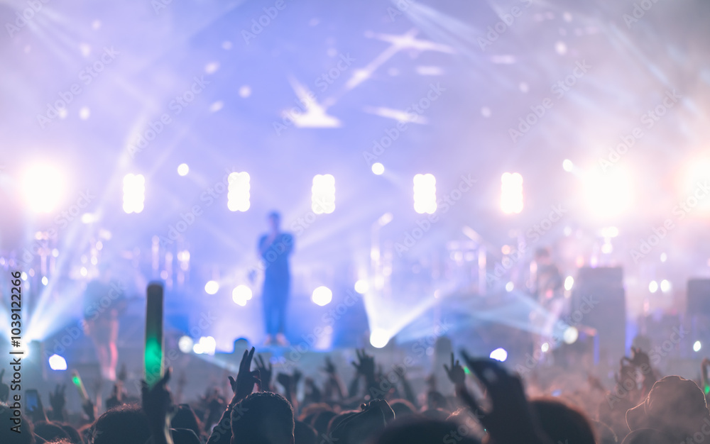 musician, party, entertainment, festival, applauding, audience, dancing, disco, live, nightclub. A concert with a crowd of people and a man singing in the middle. The crowd is waving their hands.