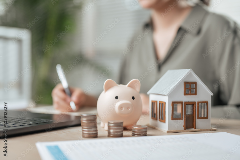 residential, loan, housing, wealth, construction, estate, insurance, mortgage, ownership, plan. A woman is sitting with a piggy bank and a stack of coins. She is writing something down with a pen.