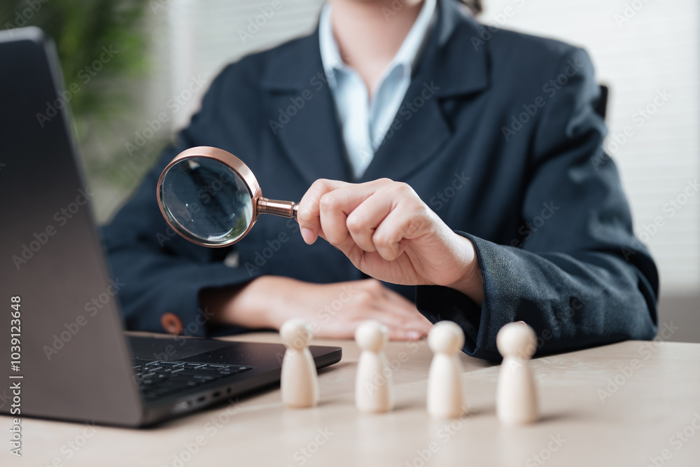 recruitment, research, magnifying, magnifying glass, employment, find, group, hiring, detective, resource. A woman is holding a magnifying glass over a laptop.