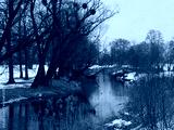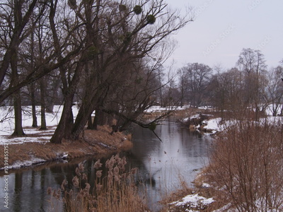 Winter time, park in winter, waterfowl, ducks, swans on canal in park.