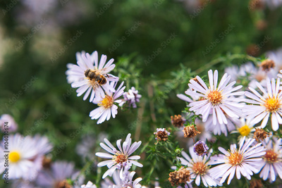The bumblebee sitting on daisies. A bumblebee close up on a flower. Violet flowers and bumblebee.