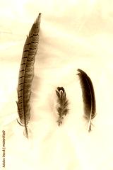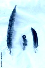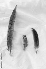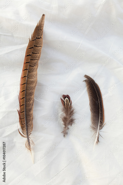 feathers of birds on a white foneyo. Feathers of birds on fabric. Three feathers. Feathers of birds of the different size. Indian feathers. Reathers of wild birds.