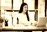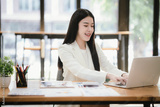Beautiful Asian female accountant working with smartphone and laptop at her desk analyzing business reports and documents. Sending messages
