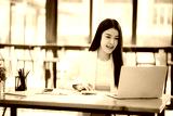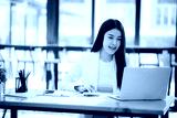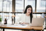 Beautiful Asian female accountant working with smartphone and laptop at her desk analyzing business reports and documents. Sending messages