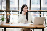Beautiful Asian female accountant working with smartphone and laptop at her desk analyzing business reports and documents. Sending messages