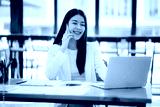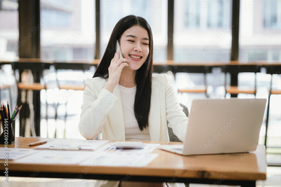 Beautiful Asian female accountant working with smartphone and laptop at her desk analyzing business reports and documents. Sending messages
