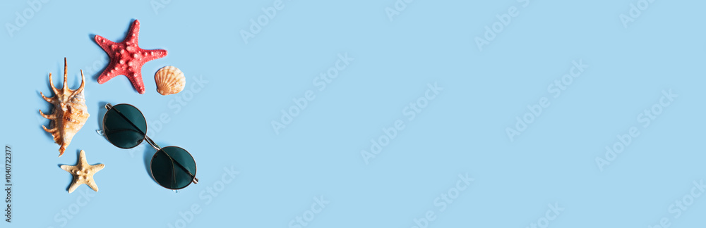 Summer time vibes, minimal coposition with set of sunglasses, starfish and sea shells on blue background. Travel vacation concept, trendy photo. Flat lay, top view, frame, place for text. banner