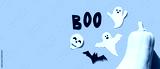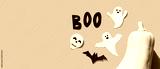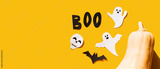 Halloween set decorations with ghost, bat, pumpkin, skeleton and word BOO on yellow background. Holiday party, minimal greeting card, spooky concept. flat lay, copy space, top view, place for text