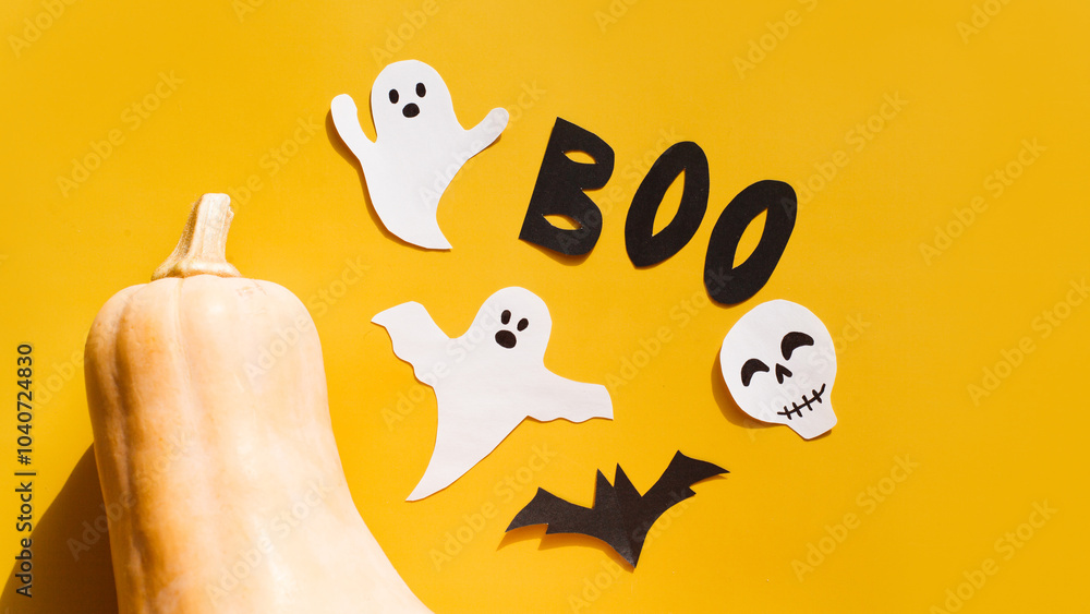 Halloween set decorations with ghost, bat, pumpkin, skeleton and word BOO on yellow background. Holiday party, minimal greeting card, spooky concept. flat lay, copy space, top view, place for text