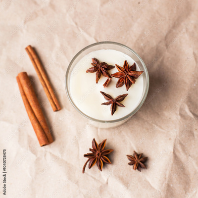 Christmas composition soy wax handmade candles in glass jars, soy candles decorated with star anise, cinnamon and dried oranges. Home therapy and relaxing concept. Scented candle, aesthehic product
