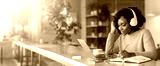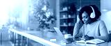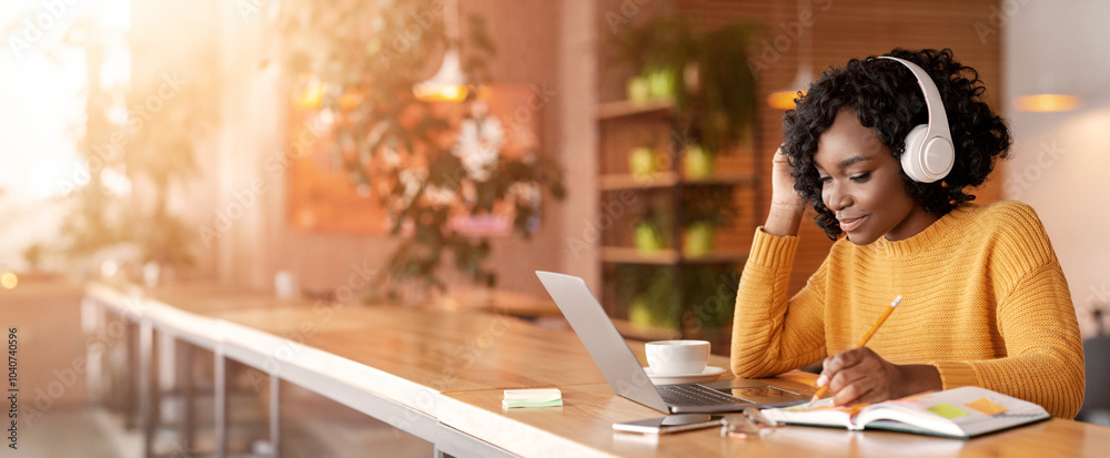 Smiling black girl with wireless headset studying online, using laptop at cafe, taking notes, copy space