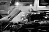 Maintenance of car air conditioning systems A mechanic holds a dusty car air filter to check for cleanliness, dirt, or repair heating problems or change the filter.