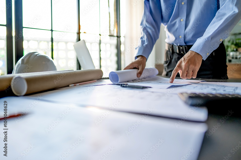 Interior architect or engineer working on blueprint at home office