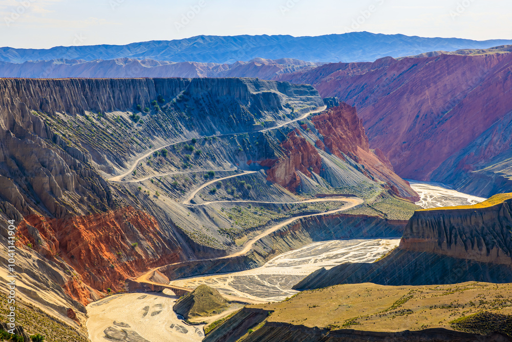 Spectacular Anjihai Grand Canyon natural landscape in Xinjiang. Famous earthquake fault zone scenery in China. mountain faults and canyon with rivers.
