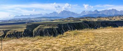 Dirt road square and canyon with mountain natural landscape under blue sky. car background.
