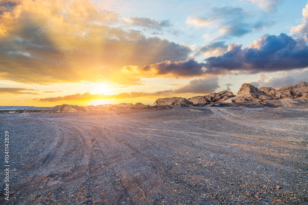 Desert sand ground and sky clouds natural landscape at sunset. road trip.