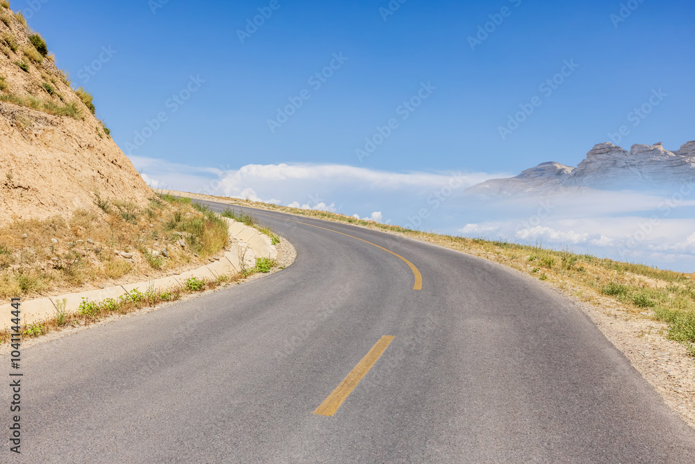 Asphalt road and mountain nature landscape under blue sky. Road trip.