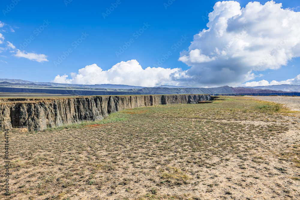 Gravel road and grass platform with canyon natural landscape in Xinjiang. car background.