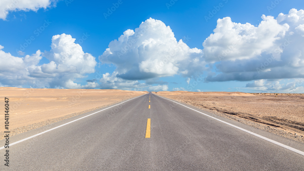 Straight highway road and desert sand natural landscape under the blue sky. road trip.
