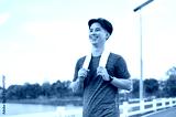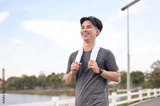 Smiling young asian man jogging in the park on cloudy day. Fitness and active lifestyle