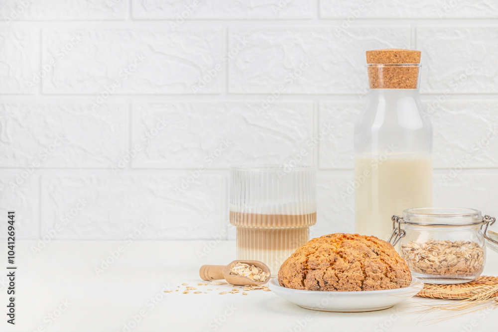 Homemade gluten free oatmeal cookies with with a glass of latte on a light background, copy space