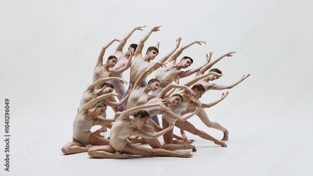 Ballet dancers performing contemporary piece with expressive movements, demonstrating blend of modern art and traditional ballet techniques in visually stunning display. Art, classical dance concept