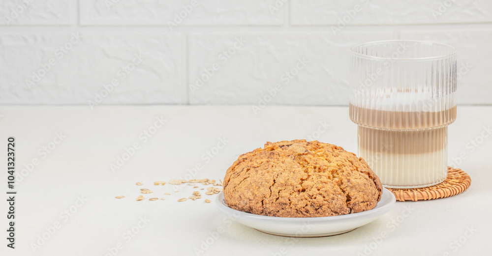 oatmeal cookies with with a glass of latte on a light background, copy space