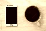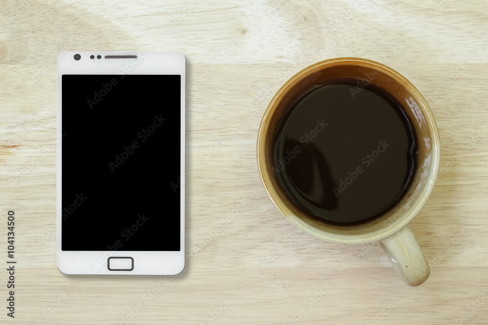 Fresh Black Coffee in a Ceramic Cup on a Wooden Table and mobil