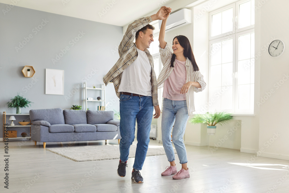 Happy laughing spouses dancing at home, having fun in new living room, playful and affectionate family, couple partners enjoy romantic relationship in comfortable domestic setting, homeowners moving