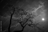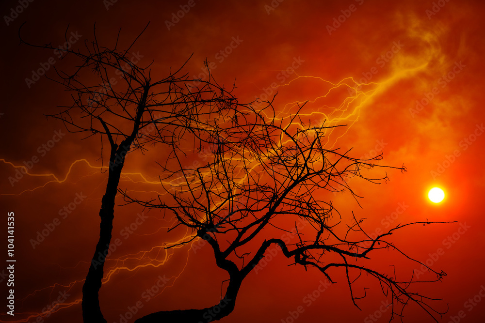 Dry tree with orange sky with lightning.