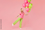 Full body side view young woman wear shirt celebrating birthday holiday stand hold bunch of colorful air balloons raise up leg pov fly isolated on plain pastel light pink background Lifestyle concept
