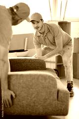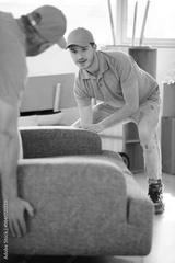 male movers placing sofa on hardwood floor at home