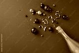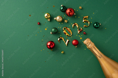 Festive New Year 2025 scene featuring golden numbers, holiday ornaments, and champagne on a green background conveying celebration and joy