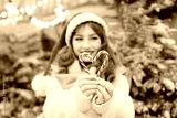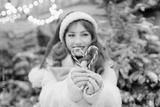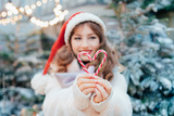 Focus on heart shape made of candy canes by young smiling woman in Santa hat on traditional street Christmas market. Happy New Year celebration Christmas holidays. Share love, charity concept