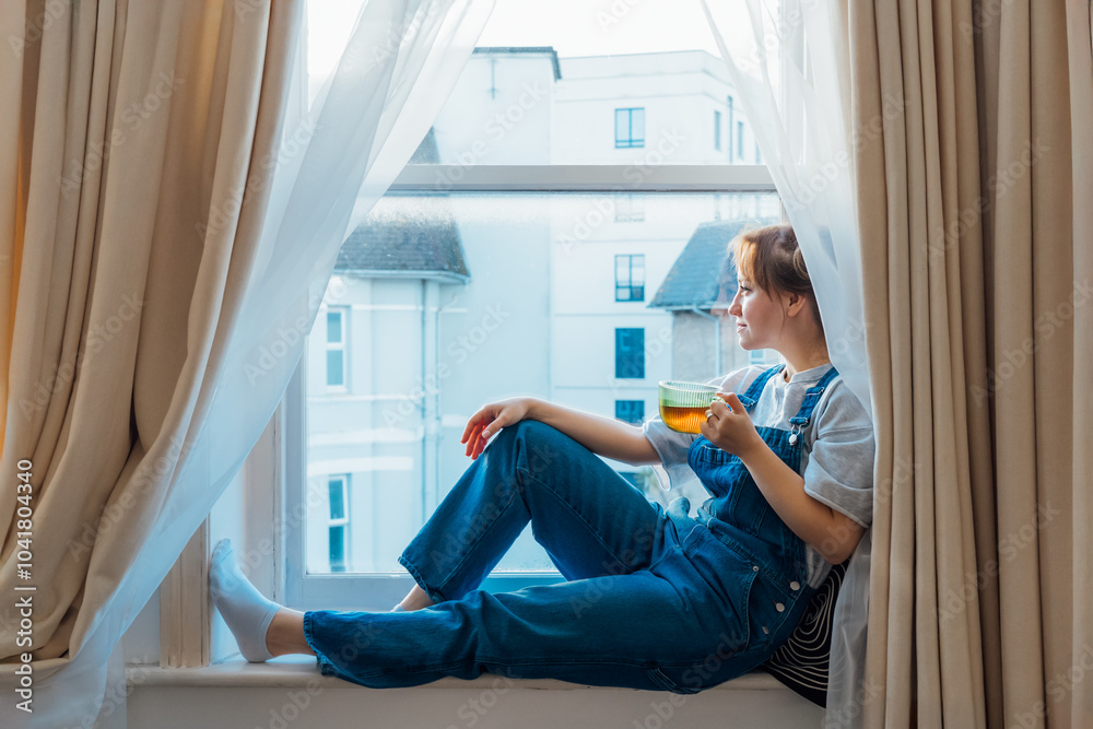 Free Time To Relax. Young woman looks out the window overlooking the city, sits on the windowsill at cozy home holds cup of hot tea drink. Happy calm female taking break for mental health wellbeing