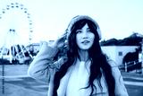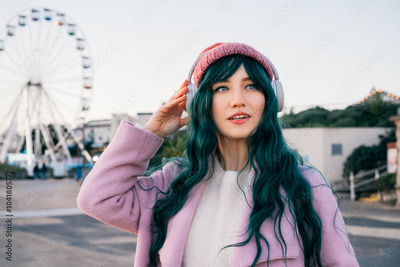Stylish young smiling hipster woman with color hair wearing wireless headphones, pink coat, knitted hat on the street walk. Happy mood. Time To Relax. seasonal fashion style trend. Barbiecore.