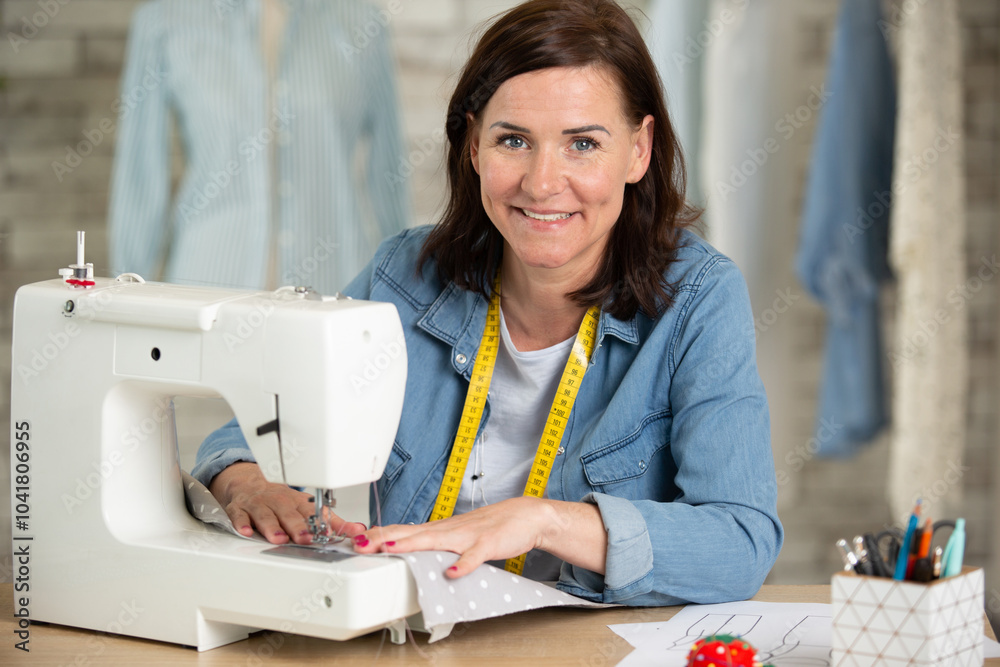 happy woman and sewing workshop