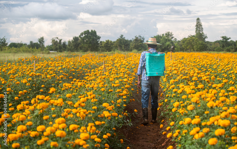 Farmer is wearinghat and a plaid shirt while carrying a green backpack sprayer spraying something on the flowers, possibly pesticides or water is caring for flower smart garden business concept.