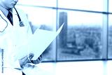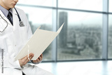 A close-up of a doctor in a white coat with a stethoscope, reading a patient's medical record with bright window background.
