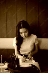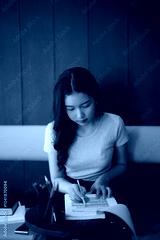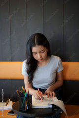 Asian teenage student woman reading information in paperwork to taking notes and doing assignment homework for preparing test exam while studying and learning about education knowledge in cafe