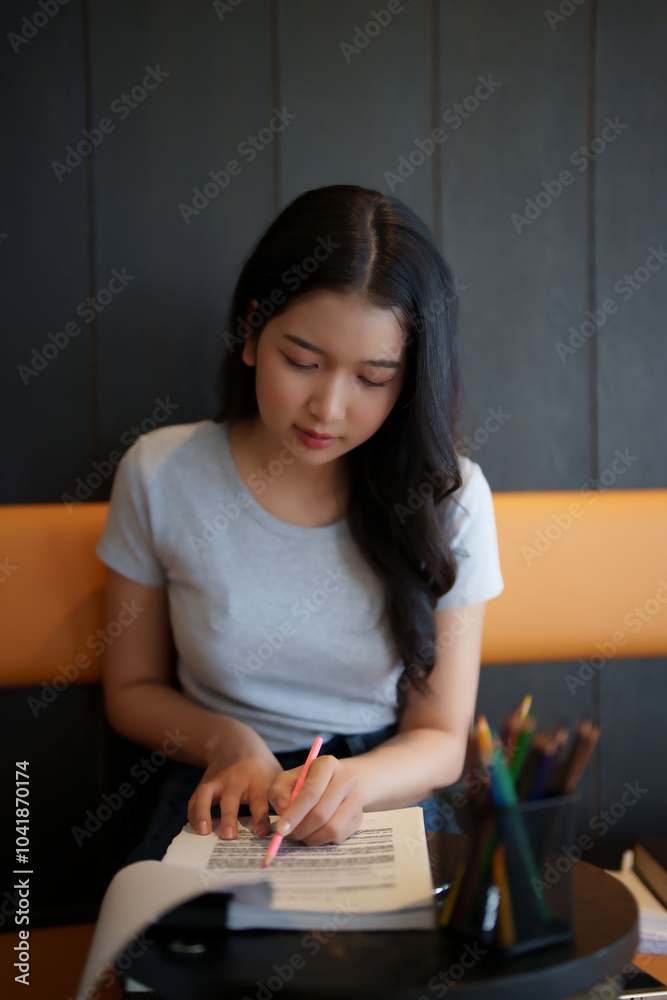 Asian teenage student woman reading information in paperwork to taking notes and doing assignment homework for preparing test exam while studying and learning about education knowledge in cafe